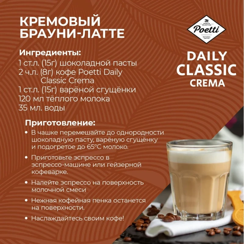 Poetti Daily Classic Crema — достойный выбор для тех, кто ценит качественный кофе премиум-сегмента.