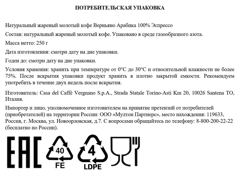 Кофе Vergnano Эспрессо арабика молотый, 250г