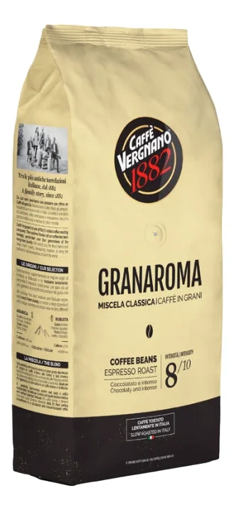 Купаж Granaroma отличается превосходным и гармоничным ароматом и балансом; сочетание нежной центральной и южноамериканской арабики и изысканной азиатской робусты придаёт этому кофе приятное шоколадно-карамельное послевкусие. Смесь для тех, кто ищет плавности в крепком, структурированном и насыщенном кофе. Аромат: сухофрукты, древесные ноты, чернослив. Послевкусие: горький шоколад, корица, жареная карамель. Подходит для всех способов приготовления: профессиональная кофемашина, автоматическая кофемашина, альтернативные способы заваривания. Классический купаж лучших сортов Арабики и Робусты. Зерна, выращенные на плантациях Центральной Америки, подвергаются строгому отбору, а затем медленно обжариваются по традиционной технологии семьи Верньяно. Готовый напиток порадует вас крепким вкусом, насыщенной консистенцией, устойчивой пенкой и богатым ароматом. Продукт одинаково хорошо подойдет как для кафе, баров и ресторанов, так и для употребления в домашних условиях. Вакуумная упаковка надежно сохраняет свежесть и органолептические свойства зерен.