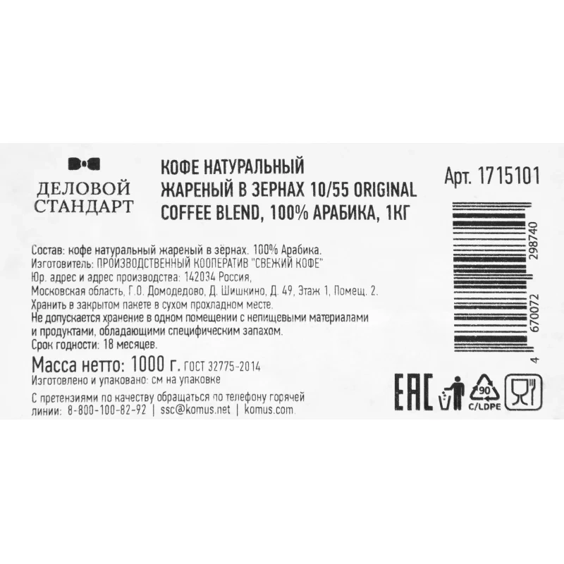 Кофе в зёрнах Деловой Стандарт 10/55 Ethiopia&Brazil Original coffee blend арабика 100% 1 кг (пакет)