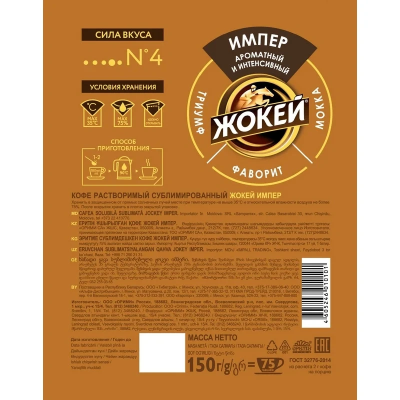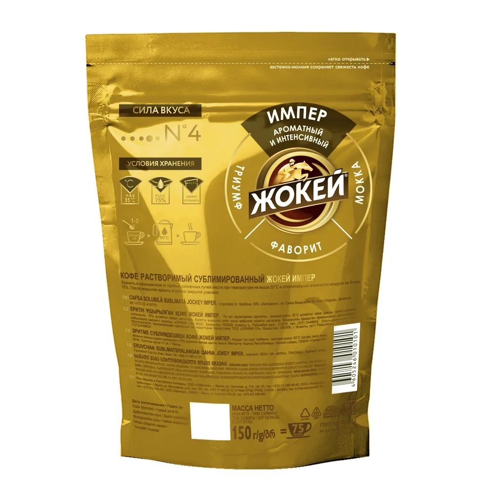 Кофе растворимый сублимированный Жокей Импер 150 г (пакет) создан по технологии фриз-драйд, которая позволяет сохранить насыщенный кофейный вкус и богатый аромат, присущий отборным зернам арабики. Купаж состоит исключительно из 100 % натурального кофе, без добавления посторонних компонентов. Напиток обладает крепким, насыщенным вкусом с приятной горчинкой и легкими фруктовыми нотками.
