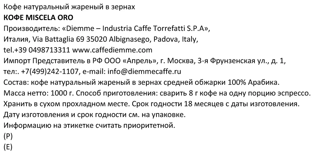 Кофе Caffe Diemme Oro 100% арабика зерновой, 1кг