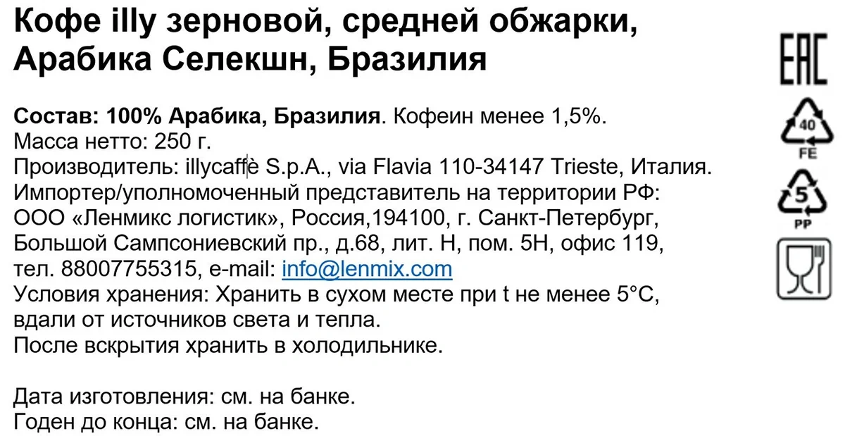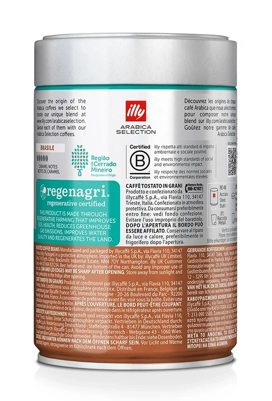 Кофе в зернах Illy Brasil, арабика 100%, 250г, ж/б