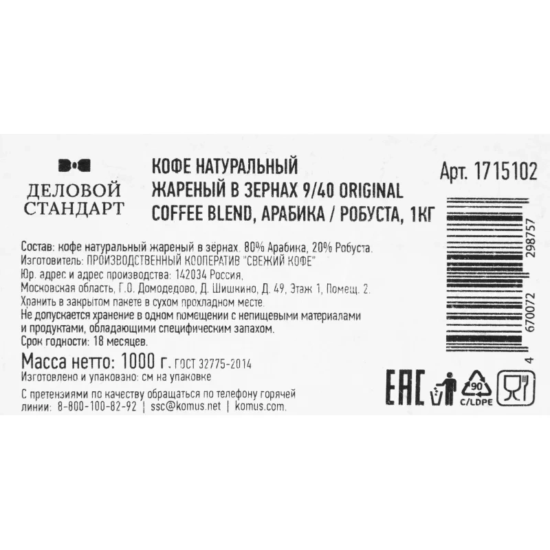 Кофе в зернах Деловой Стандарт Brazil Original coffee blend, 1кг, пачка
