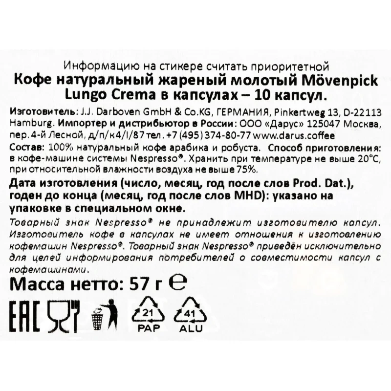 Кофе в капсулах Movenpick Lungo Crema, 10 капсул