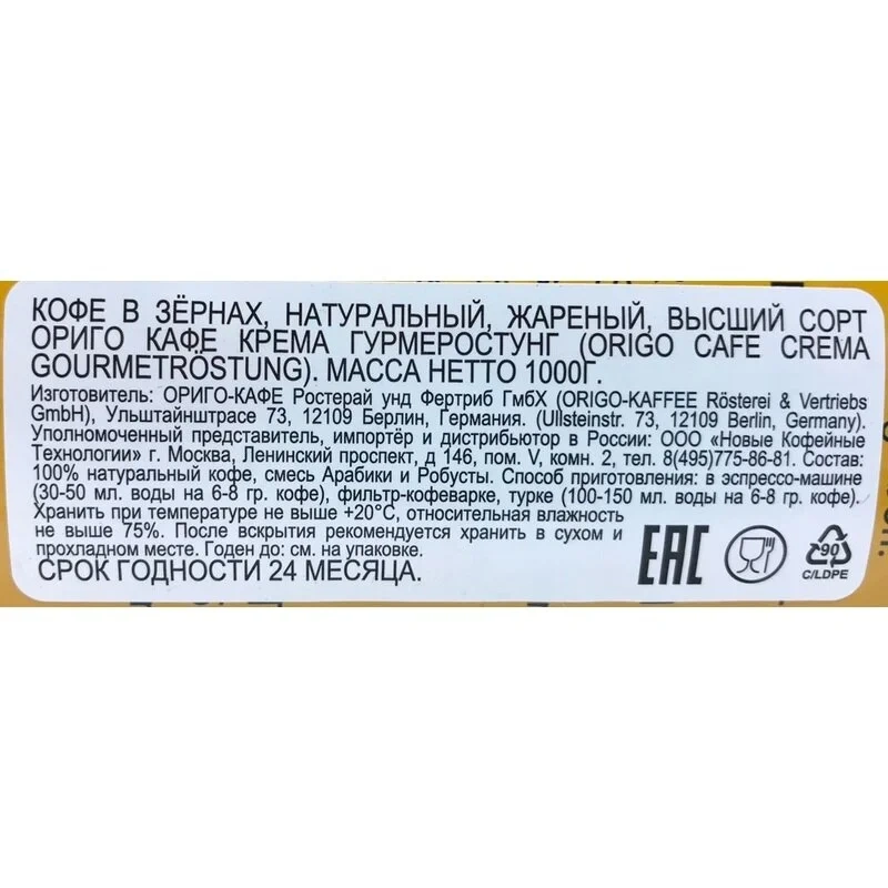 Кофе в зернах ORIGO (ОРИГО) 'Cafe Crema', 1000 г, вакуумная упаковка, 3004001000