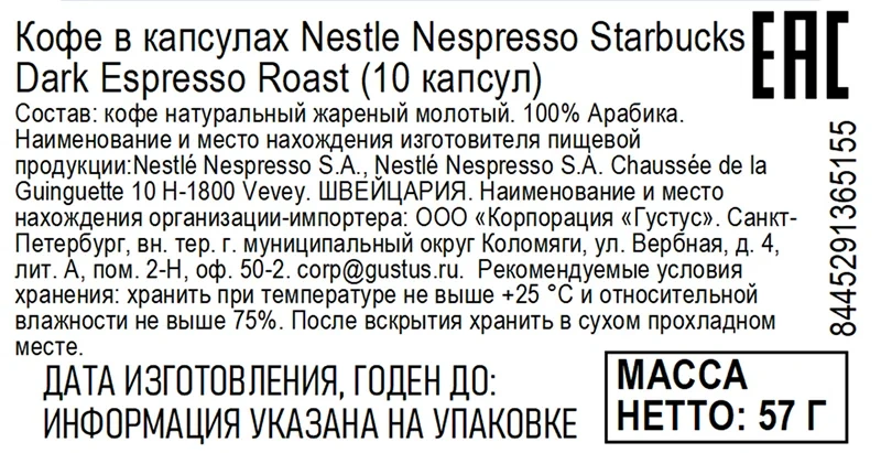 Кофе в капсулах для кофемашин Starbucks Dark Espresso 10шт, 55г