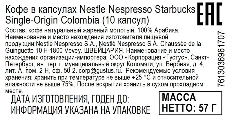 Кофе в капсулах для кофемашин Starbucks Single-Origin Colombia 10шт, 57г