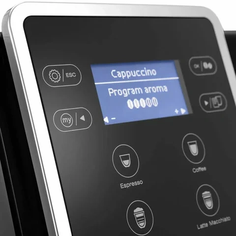 Перед вами один из лучших представителей DELONGHI, в котором применены проверенные решения. Собственная встроенная кофемолка с возможностью выбрать степень помола зерен (емкость вмещает до 250 г зерен), мощная помпа (15 бар), которая обеспечивает правильное приготовление эспрессо. Также имеется быстросъемный капучинатор. Широкая сенсорная панель с клавишами быстрого доступа и цветным TFT-дисплеем является не только функциональным элементом, но и эффектно выглядит, придавая кофемашине современный вид.