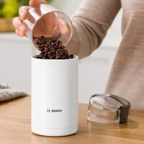 Кофемолка Bosch TSM6A011W оснащена функцией автоматического отключения при открытии крышки для безопасной эксплуатации.
