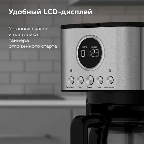 Удобные часы и таймер отложенного старта помогут вам заранее запланировать время заваривания, чтобы насладиться свежеприготовленным кофе прямо с утра.