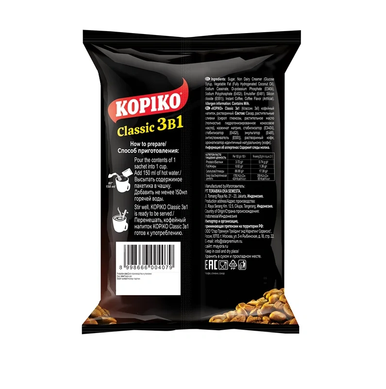 Кофейный напиток Kopiko 3 в 1 Classic 20шт х 20г, 400г