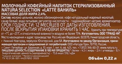 Кофейный напиток Natura selection Latte Ваниль, 220мл