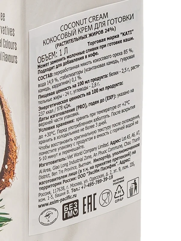 Польза кокосовых сливок очевидна: богатый состав витаминов В, А и С. Важные микро- и макроэлементы: калий, кальций, магний, фосфор, железо, марганец, цинк и медь. В составе переработанная мякоть кокосового ореха 99,9 %, стабилизаторы (0,1%) - ксантановая камедь, гуаровая камедь и каррагинан. Стабилизаторов не стоит бояться. На самом деле - это все натуральные компоненты.
