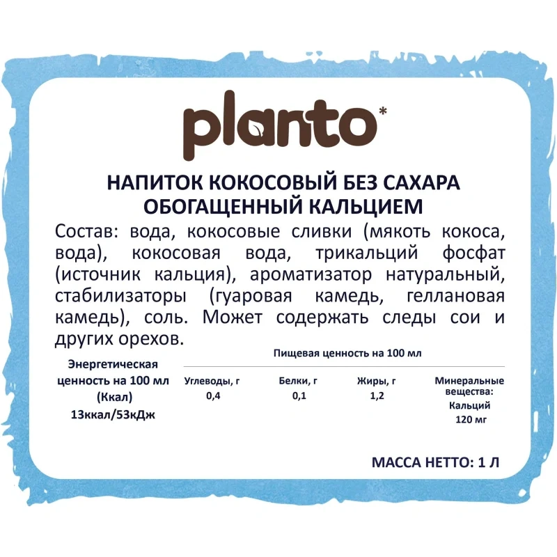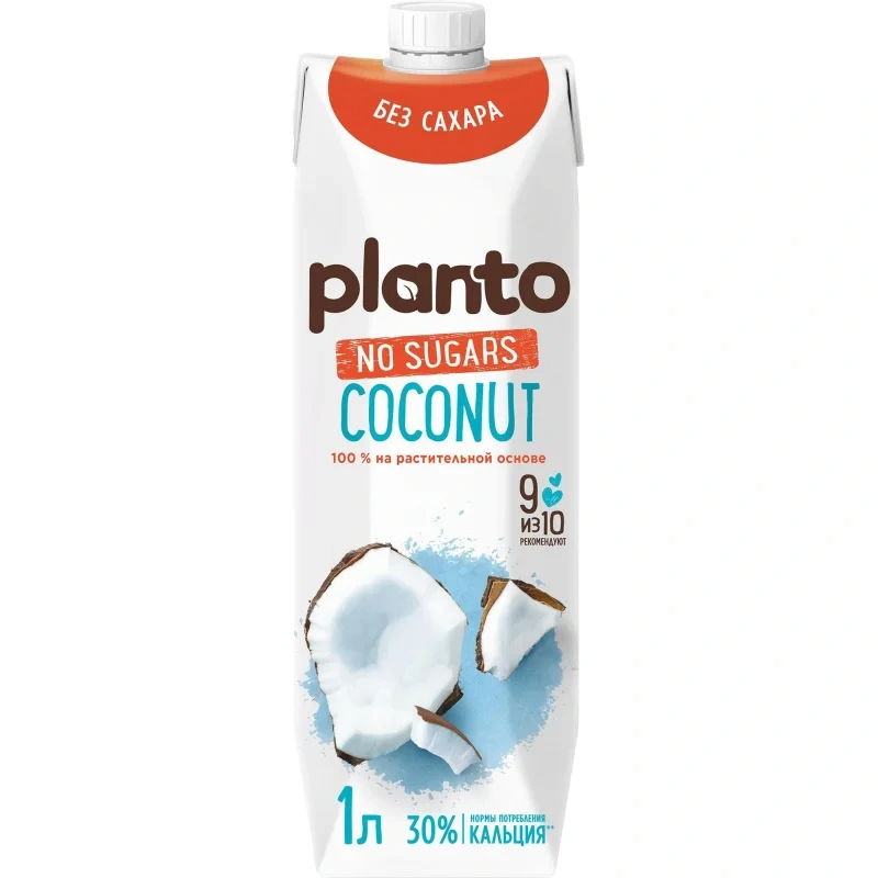 Напиток растительный Planto кокосовый 1 л. Напиток растительный Planto кокосовый без сахара 1.2% - это продукт на 100% растительной основе, предназначенный для тех, кто заботится о своем питании и предпочитает натуральные продукты. В нем отсутствуют сахар и подсластители, что делает его идеальным выбором для людей, следящих за уровнем сахара в рационе. Напиток обладает насыщенным тропическим вкусом кокоса и является отличным источником пищевых волокон и кальция - 30% от дневной нормы. Это идеальный напиток для офисного потребления, а также для завтраков, например, с кашей или хлопьями. Он также прекрасно утоляет жажду и придает экзотический вкус при употреблении прямо из стаканчика. Состав: вода, кокосовые сливки (мякоть кокоса, вода), кокосовая вода, трикальций фосфат (источник кальция), ароматизатор натуральный, стабилизаторы (гуаровая камедь, геллановая камедь), соль. Энергетическая ценность на 100 г: 13 ккал. Пищевая ценность на 100 г: белки - 0.1 г, жиры - 1.2 г, углеводы - 0.4 г. Условия хранения: хранить при температуре от 0 до 25 C. Срок хранения: 9 месяцев. Стандарт: ГОСТ 31450-2013. Страна производства: Россия. Внешний вид и/или характеристики товара могут быть изменены производителем в соответствии с производственным процессом.
