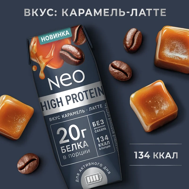 Коктейль молочный NEO HIGH PROTEIN обезжиренный - высокобелковый напиток со вкусом Карамель-латте, предназначенный для восполнения суточной нормы белка без добавления сахара. Белок является незаменимым элементом для спортивной и активной жизни человека, способствуя росту мышечной массы. В одной порции содержится 20 г протеина, что составляет 26% от суточной потребности в белке.