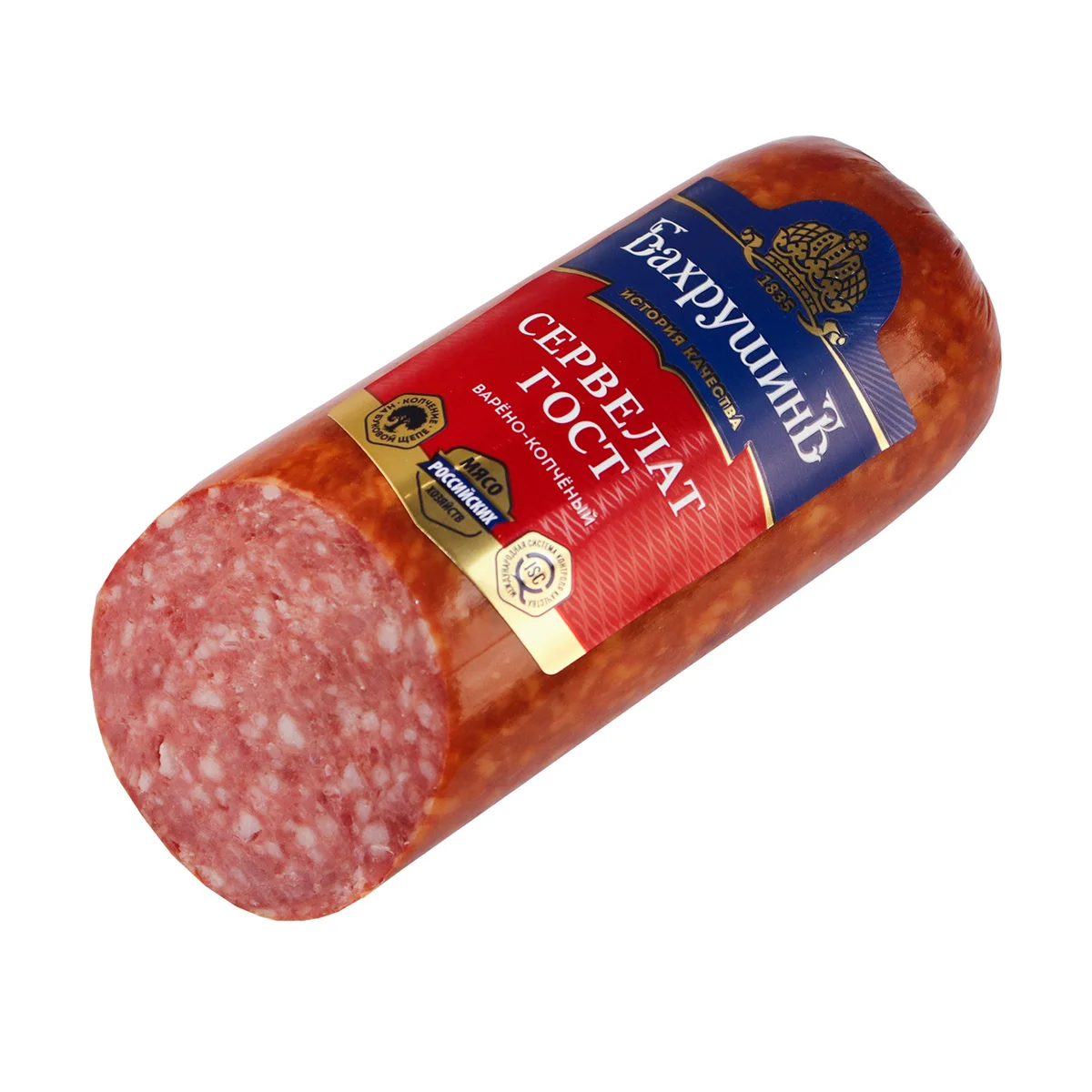 Сервелат ГОСТ БахрушинЪ обладает характерным мясным вкусом и ароматом копчения. Приготовлен из нежной свинины и говядины с добавлением отборных пряностей. Сервелат имеет красивый срез и упругую структуру. Идеально подходит для приготовления бутербродов, а также станет прекрасным украшением праздничного стола. Изготовлена в строгом соответствии ГОСТ из говядины высшего сорта и нежирной свинины. Грудинка с прослойками мяса и нежнейшего шпика мелко-мелко измельчается, благодаря чему получается такой любимый нами равномерный рисунок среза. Ароматный перец и мускатный орех отвечают за оригинальную пикантность классического насыщенного мясного вкуса.