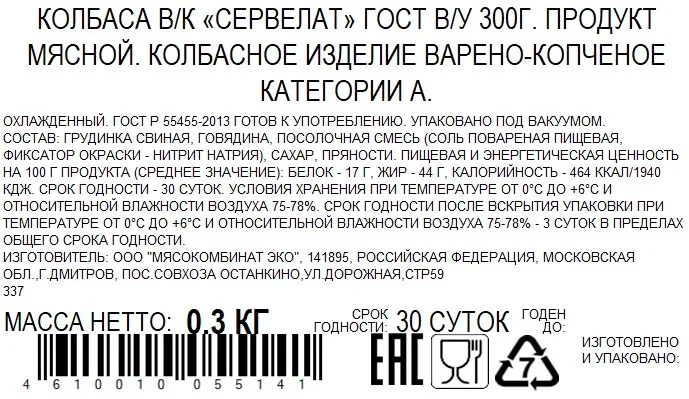 | Вид колбасы | сервелат |