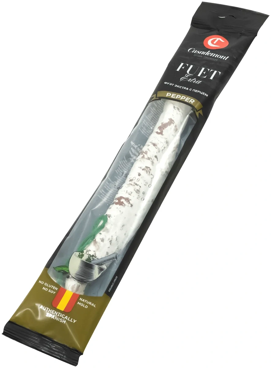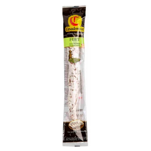 Колбаса Casademont Fuet Extra сыровяленая с перцем, 110 г – это вкусный сыровяленый продукт. Он имеет насыщенный, острый вкус и приятный аромат. Его удобно использовать как перекус или закуску к пенному. Отлично подходит для быстрого перекуса в составе бутербродов или сэндвичей. Также широко используется для приготовления различных блюд, в частности салатов, запеканок и пиццы. Кроме неповторимых ароматических и вкусовых свойств, для сыровяленной колбасы свойственна плотная и упругая структура.