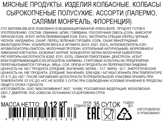 Колбаса Палермо имеет однородную структуру крупнорубленого мяса и обладает умеренно пряным вкусом. Особая форма ломтиков предназначена специально для сытных тостов. Её можно использовать для приготовления бутербродов, аппетитных рулетиков, омлетов и питательных салатов. Монреаль - сырокопчёная колбаса из свинины с красивым зернистым рисунком на срезе. Изготовлена с добавлением пикантных специй. Сочная и нежная, нарезанная на аккуратные слайсы, она отлично дополнит мясную тарелку и сытные сэндвичи. Флоренция - сырокопчёная колбаса с лёгким ароматом копчения, фактурным срезом и выраженным вкраплением крупного шпика. Конечно, эту колбасу можно использовать для классических сытных бутербродов, однако лучше всего она будет смотреться в мясных тарелках, украшая застолье. В сырокопченой сервировочной нарезке представлены классические колбасы.