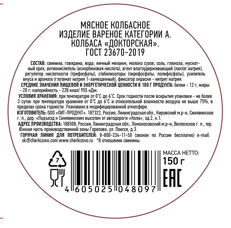 Колбаса докторская вареная Черкизово нарезка ГОСТ, 150г