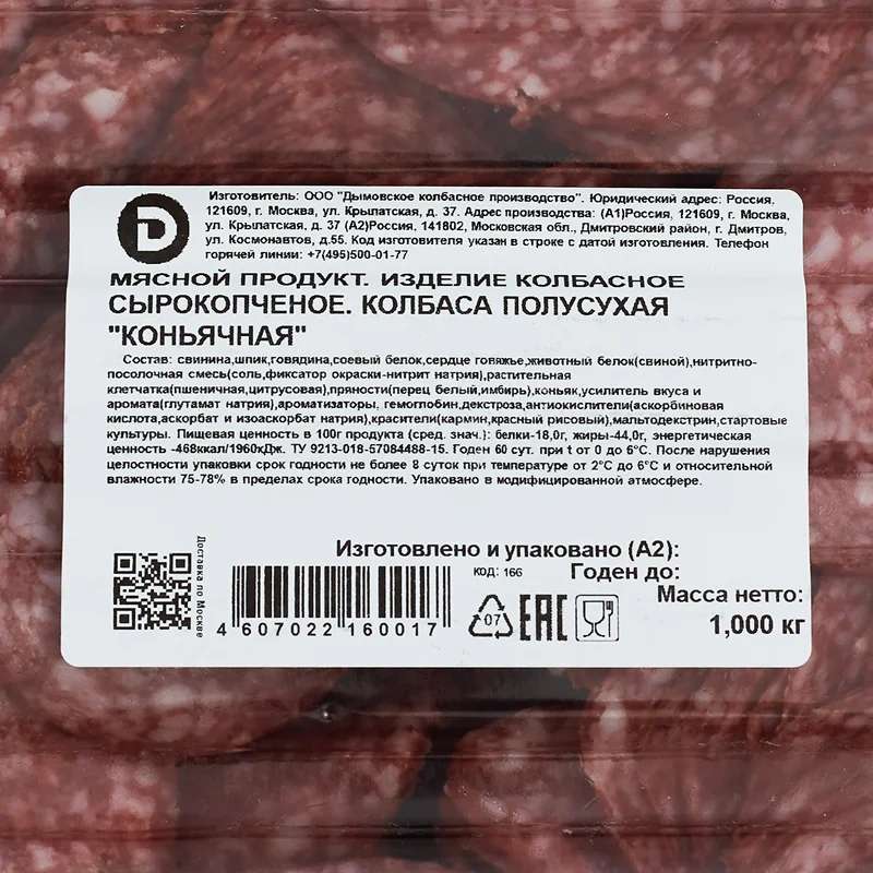 Колбаса Дымов Коньячная полусухая сырокопченая нарезка, 1кг