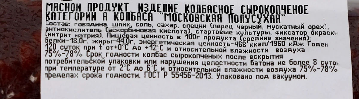 Колбаса Московская Дымов с/к обладает благородным и изысканным вкусом, благодаря чему по праву считается деликатесной продукцией. Это идеальный вариант как для утреннего завтрака и обеденного перекуса, так и для крупных застолий. Продукт изготавливается из выдержанной говядины высшего сорта и отвечает всем требованиям ГОСТа. Старинная русская рецептура позволяет добиться традиционного вкуса, знакомого каждому с детства. Вакуумная упаковка из фиброуза способствует длительному сохранению свежести, вкусовых качеств и полезных свойств продукции. Довольно крупный шпик образует красивый и насыщенный рисунок.