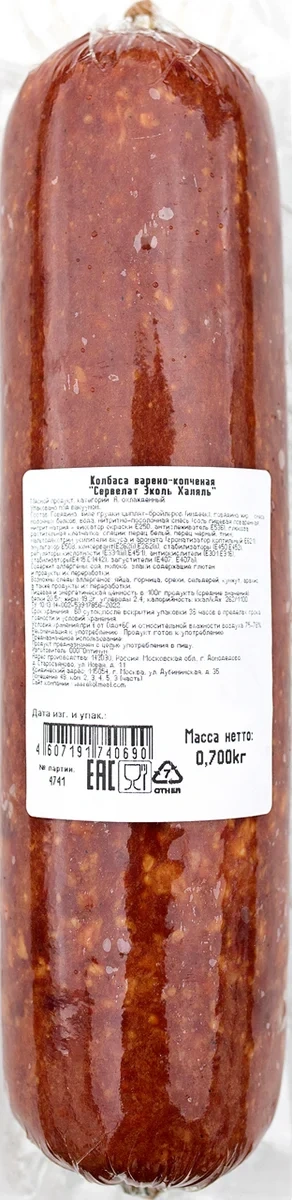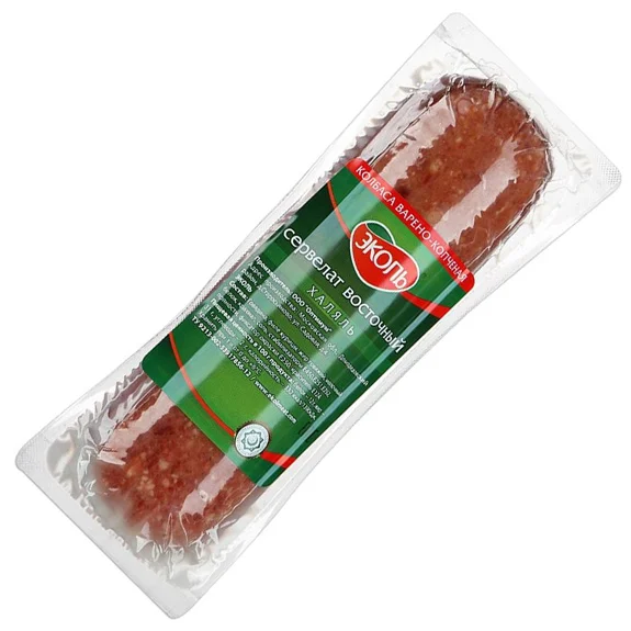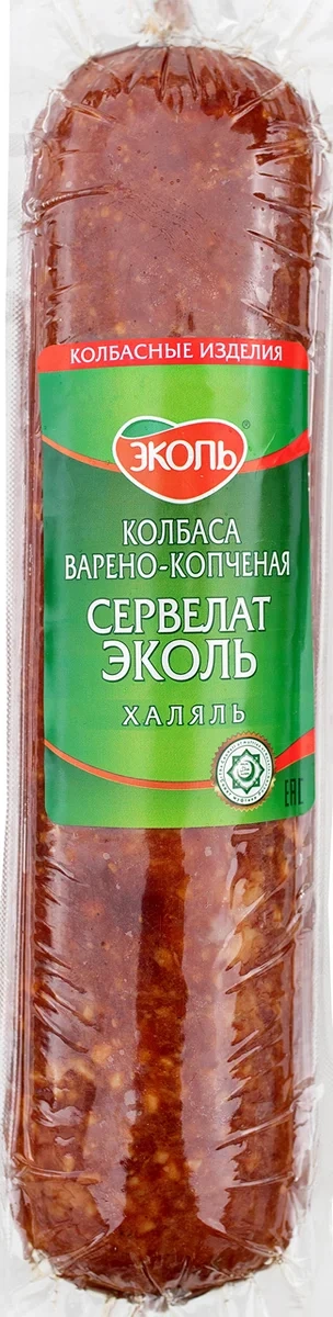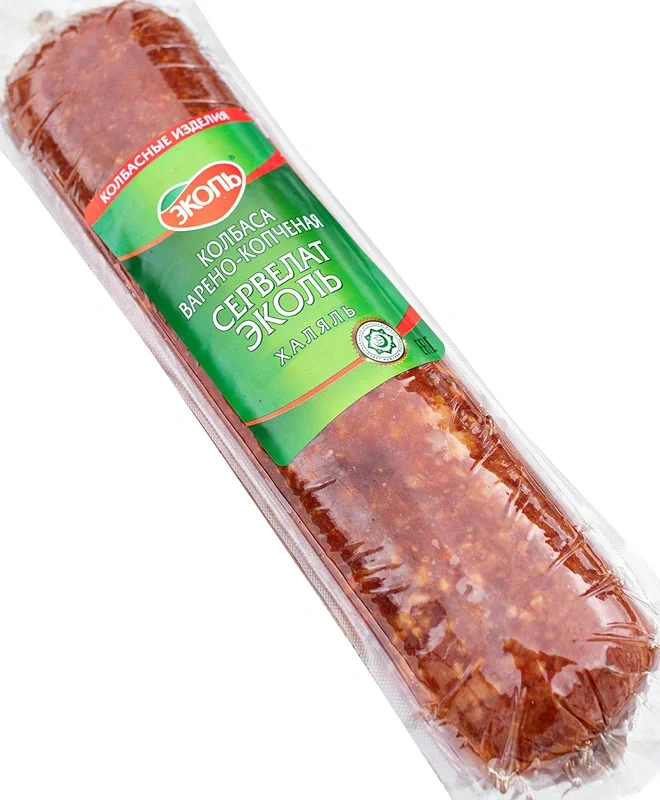 Сервелат Эколь варено-копченый халяль изготовлен по классической рецептуре с использованием высокосортного мяса. Он обладает нежной консистенцией, слегка прикопченным вкусом и приятным ароматом. В составе – отборная говядина и филе курицы, тщательно переработанные в фарш. Добавление мелких кусочков говяжьего жира придает оригинальный привкус, а набор специй обеспечивает легкую пряность. Колбаса отлично подходит как для повседневного, так и для праздничного стола. Ее можно употреблять в виде самостоятельной закуски, а можно добавлять в салаты, пиццу и другие блюда.