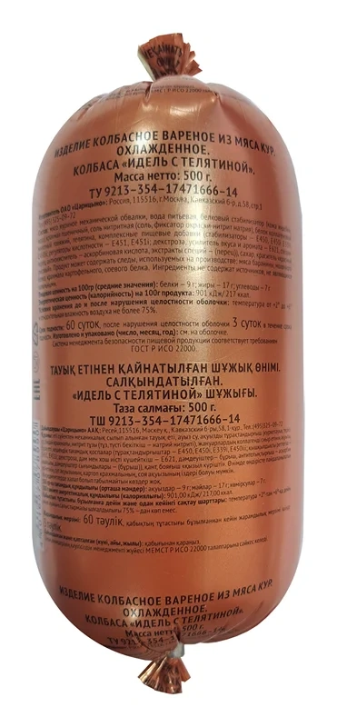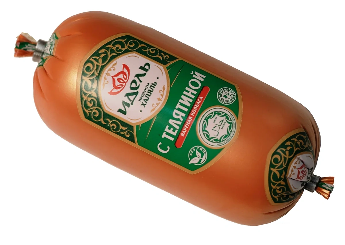 Вареная колбаса приготовлена из куриного мяса и телятины и приправлена миксом ароматных специй. Мясной продукт, изготовленный из разрешённых для мусульман продуктов и специй. В рецептуре отсутствует свинина, поэтому колбаса является халяльной. В состав включены только качественные ингредиенты.