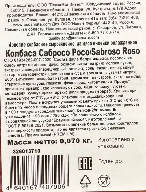 | Рекомендуемая температура хранения, C | от 0 до +6 |