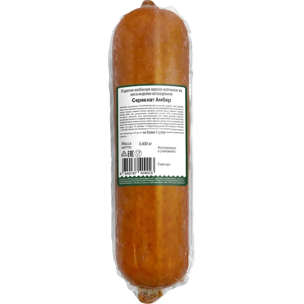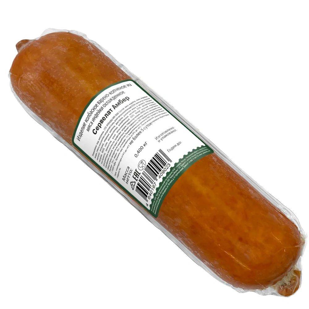 Колбаса Индилайт Сервелат Амбер варено-копченая, 400г обладает плотной и сочной структурой, насыщенным ароматом и ярким вкусом. Для производства используется фарш из индейки – мяса, для которого характерен богатый биохимический состав. В нем содержатся витамины (A, B, D, E) и целый ряд полезных элементов, в частности, калий, магний, цинк и некоторые другие. При этом мясо индейки очень питательное – при достаточно количестве калорий, оно содержит мало холестерина и считается диетическим. Белок, входящий в состав, положительно влияет на рост мышечной ткани. Такая колбаса хорошо сочетается с сыром и свежими овощами, что позволяет приготовить с ее помощью сытные и плотные бутерброды. Также ее можно нарезать небольшими ломтиками и использовать в качестве дополнения к основным блюдам.