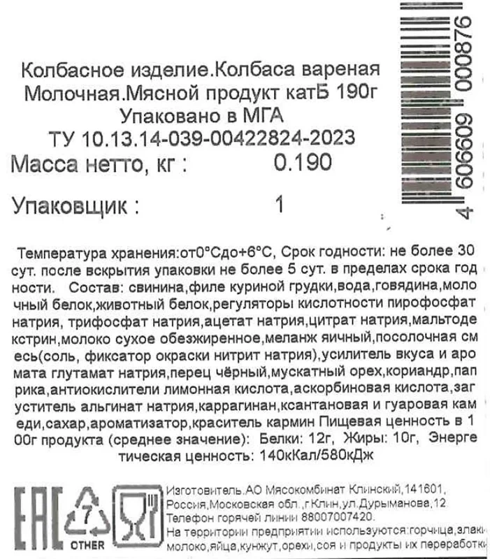 Колбаса Клинский Молочная вареная нарезка, 190г