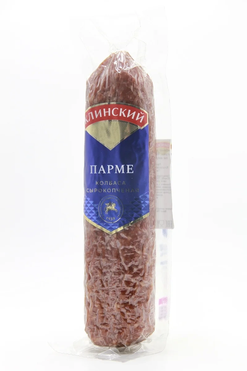 Колбаса Клинский Парме сырокопченая приготовлена по оригинальному рецепту из отборной свинины с добавлением нежной свиной грудинки. Колбаса Парме отлично сочетается с красным вином, а тонко нарезанные аппетитные кусочки придадут любому столу праздничный вид.