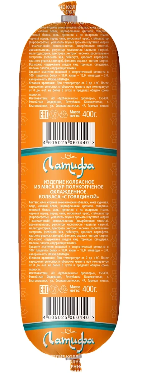 Колбаса Латифа Халяль с говядиной полукопченая, 400г