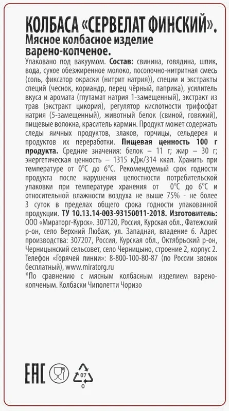 Колбаса Мираторг Финская сервелат варено-копченый, 375г