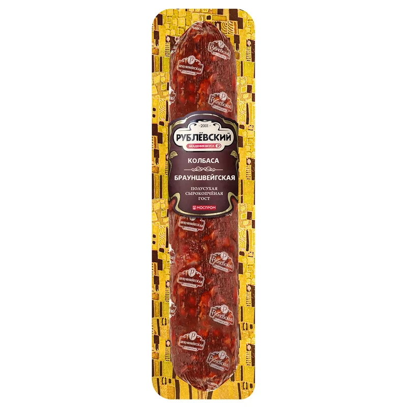 Брауншвейгская бренда Рублевский — сырокопченая колбаса в натуральной оболочке, изготовленная по классической рецептуре. Продукт соответствует ГОСТу, содержит в своем составе высококачественную охлажденную говядину и свинину со шпиком. Питательная и сытная колбаса с приятным запахом копчения и мускатного ореха подойдет для перекуса в офисе или в дороге, а также для нарезки на праздничный стол.