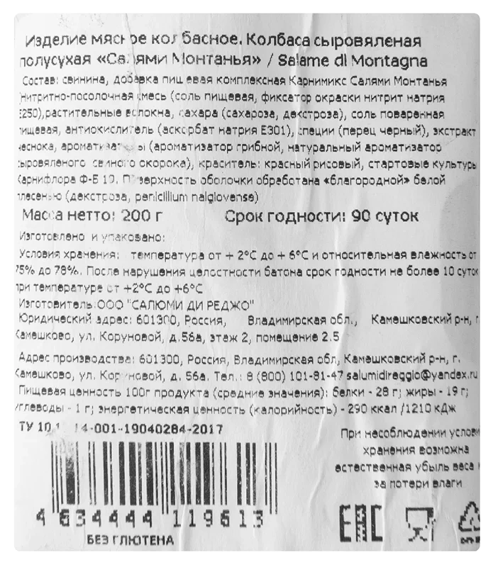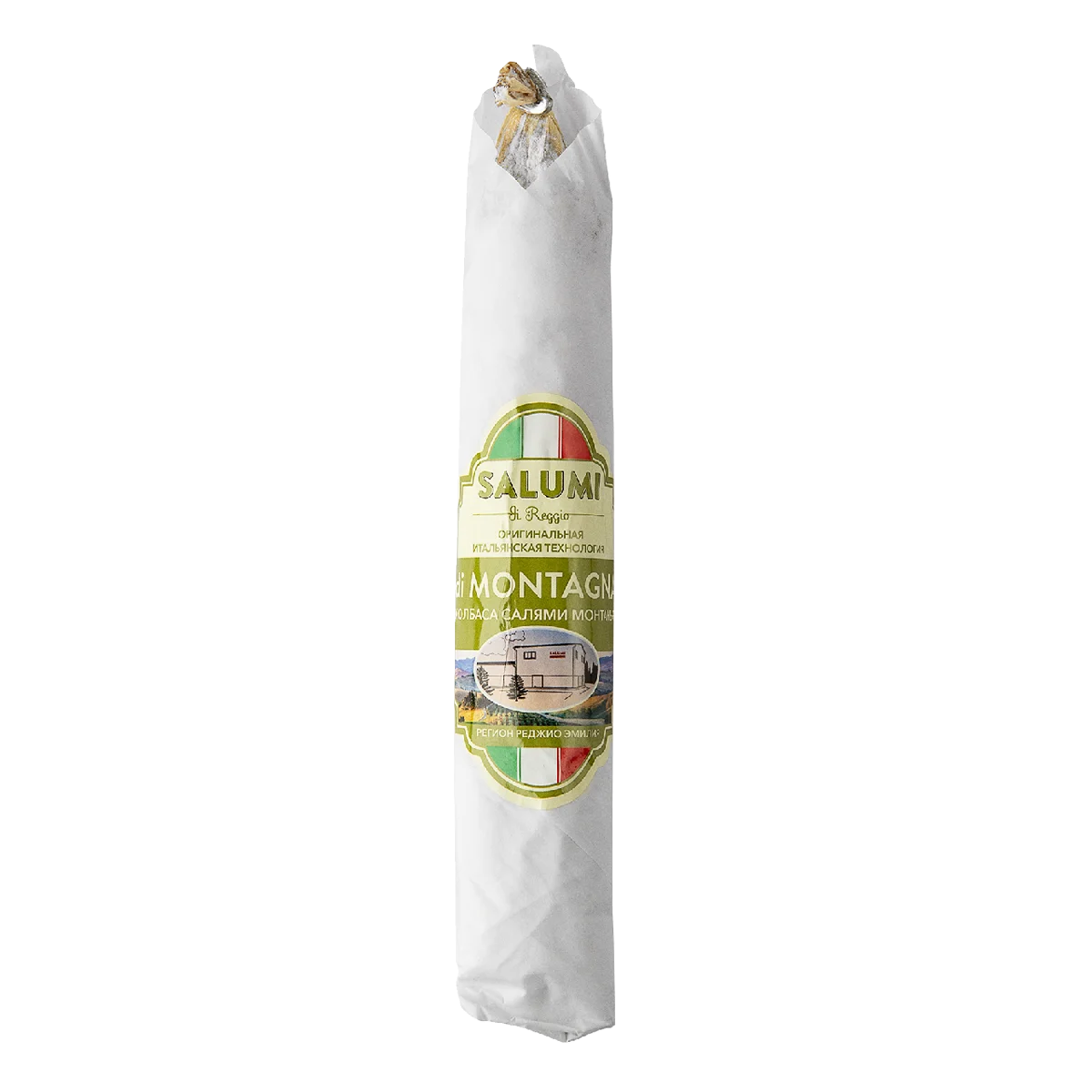 Колбаса сыровяленая полусухая Салями Монтанья - изготавливается по итальянской технологии под торговой маркой Salumu di Reggiо. Производство находится во Владимирской области в г. Камешково на территории Индустриального парка Камешково. Открытие производства осуществлялось при непосредственном участии команды профессионалов из Италии. Для её приготовления использовали только натуральное, свежее свиное мясо со свиным шпиком. Это ферментированный продукт, подвергнутый сушке, оболочка которого покрывается съедобными культурами грибка Пеницилла, что придает аромат и способствует сохранению свежести продукта. Колбаса отличается присущим ей ароматом сыровяленого свиного окорока с тонкой ноткой грибов и едва уловимым оттенком чеснока. Контрастность самой природы Италии диктует разнообразие и яркость вкусовых оттенков салями. Этот продукт широко используется в качестве самостоятельной закуски и является неотъемлемой частью некоторых видов пиццы, салатов и других блюд. Салями проходит длительный процесс вяления и обретает свой неповторимый вкус, который раскрывается даже при длительном хранении. А стаканчик красного вина и кусочек душистого сыра будут превосходным гармоничным дополнением к нашему фирменному продукту.