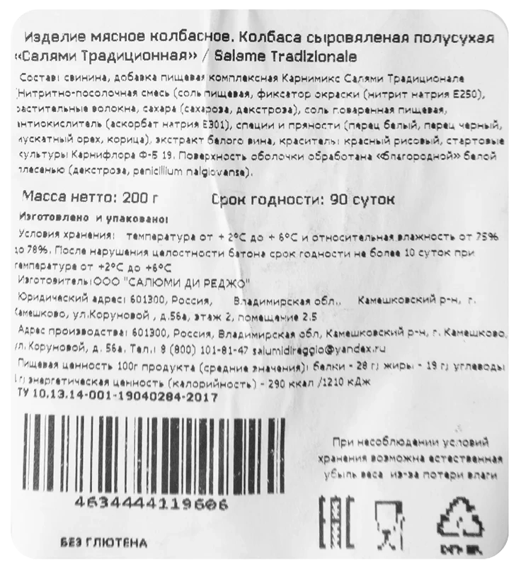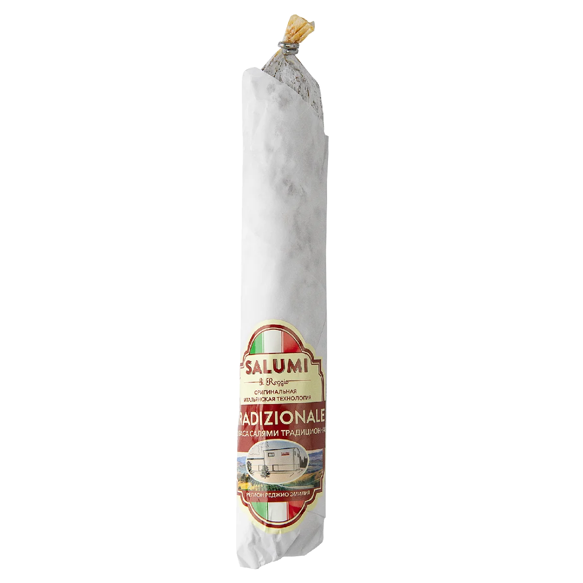 Колбаса сыровяленая полусухая Салями Традиционная - изготавливается по итальянской технологии под торговой маркой Salumu di Reggiо. Производство находится во Владимирской области в г. Камешково на территории Индустриального парка Камешково. Открытие производства осуществлялось при непосредственном участии команды профессионалов из Италии. Для приготовления колбасы с мелкозернистым рисунком использовали только натуральное, свежее свиное мясо и шпик-грудинку, а уникальные специи были специально разработаны для нашей фирмы итальянскими технологами. Это ферментированный продукт, подвергнутый сушке, оболочка которого покрывается съедобными культурами грибка Пеницилла, что придает аромат и способствует сохранению свежести продукта. Сыровяленая колбаса проходит длительный процесс вяления и превращается в ту салями, что режут тонкими, в толщину бумажного листа, ломтиками и раскладывают на кусок свежеиспеченного хлеба. А еще стаканчик красного вина и кусочек душистого сыра – и Ваши гости будут в восторге!