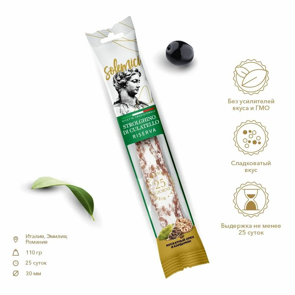 Очаровывает легким ароматом мускатного ореха, кардамона, приятной полутвердой консистенцией. Созревает не менее 25 суток. Подается толсто нарезанными кусочками. По желанию можно оставить оболочку с белой плесенью, она придаст колбаске дополнительный легкий грибной аромат со сливочным оттенком! Тост из свежего хлеба с ломтиками Строльгино ди Кулателло придаст вашему утру особый вкус, а вечером станет прекрасной закуской к аперитиву или бокалу Ламбруско.