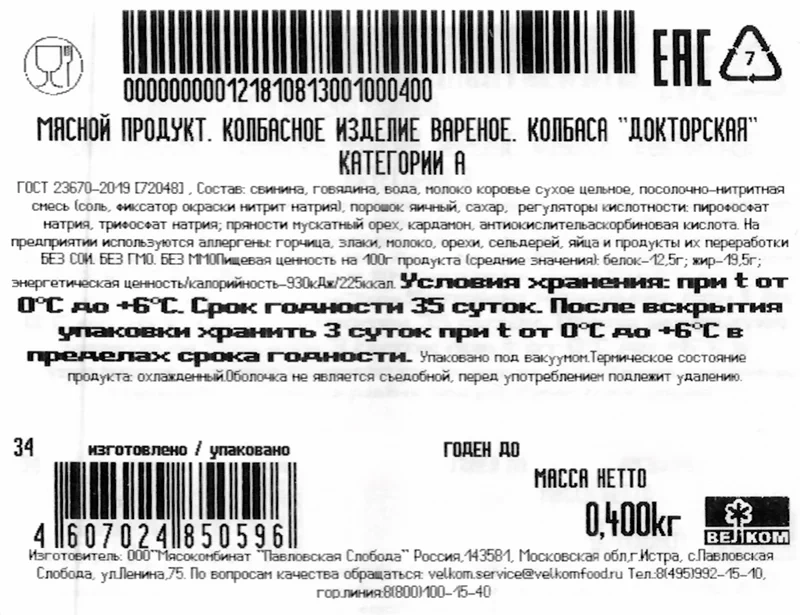| Рекомендуемая температура хранения, C | от 0 до +6 |