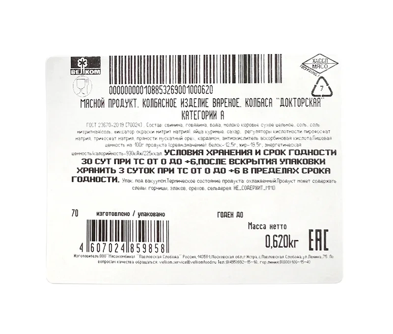 Колбаса Докторская ВЕЛКОМ, 620г станет настоящим открытием для любителей мясных продуктов. Она изготовлена согласно современным стандартам ГОСТ на передовом оборудовании. Колбаса торговой марки «Велком» разнообразит ваш повседневный стол своим оригинальным вкусом. Она имеет однородную структуру и нежно-розовый цвет. Идеально подходит для бутербродов, салатов и канапе.Компания ВЕЛКОМ успела зарекомендовать себя на российском рынке, как производитель качественной мясной продукции. Это достигается за счет использования свежего мяса от лучших отечественных животноводческих хозяйств и идеальных санитарных условий на производстве. Основной принцип работы компании – это забота о покупателе.Состав: свинина, говядина, вода, яичный порошок, молоко сухое, соль, комплексная пищевая добавка Докторская комби, фиксатор окраски нитрит натрия.Продукт охлажден. Упаковано под вакуумом.Высший сорт. Без ГМО. Без сои.Пищевая ценность на 100г: белки - 13г, жиры - 22г.Энергетическая ценность: 253 ккал.Хранить при Т от 0'C до +6'C.Срок годности: 30 суток.Производитель: ООО Мясокомбинат Павловская Слобода, Московская обл., Истринский р-н, с. Павловская Слобода, ул. Ленина, 75, Россия.