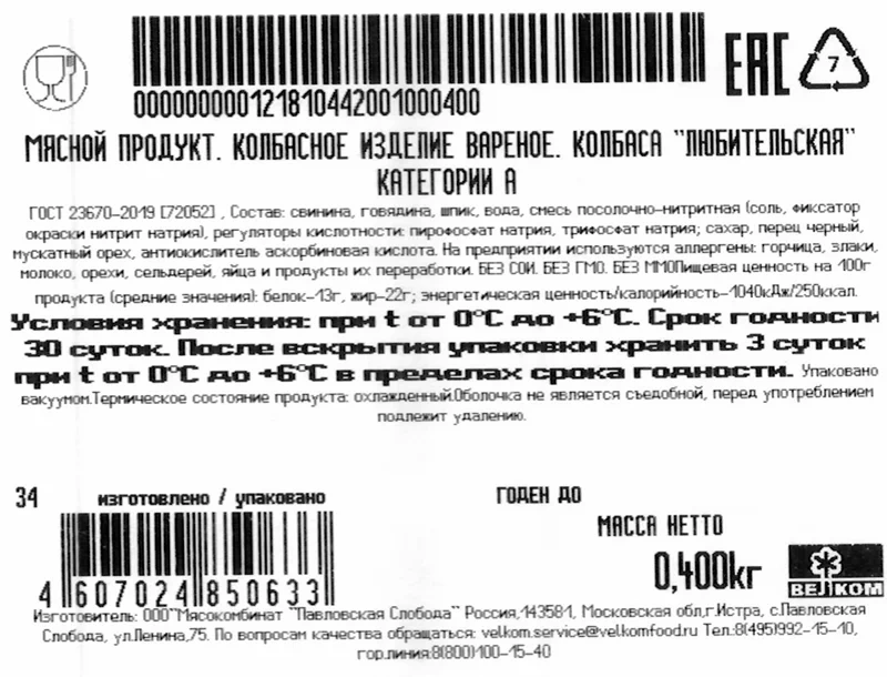 | Вид колбасы | любительская |