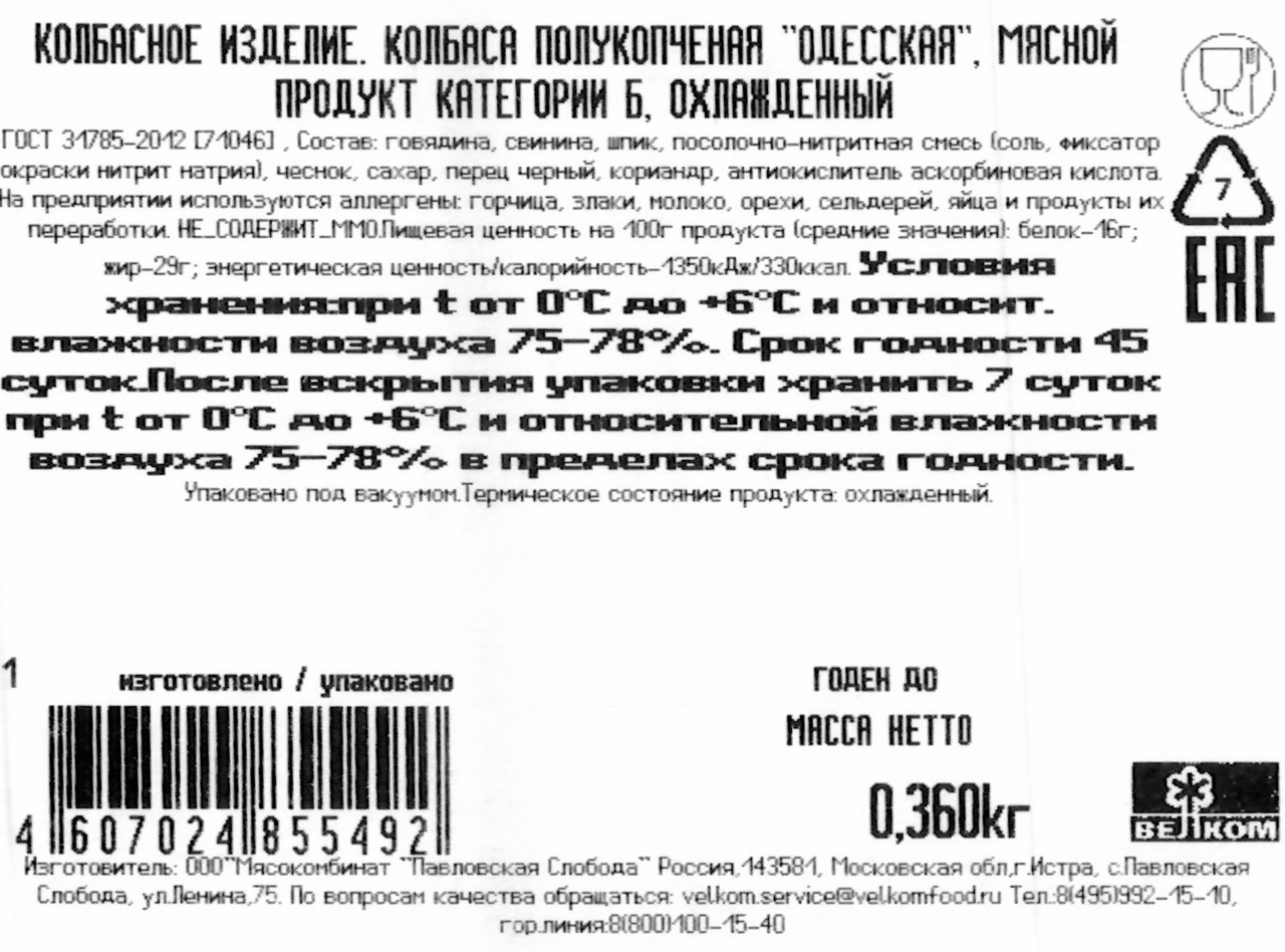 | Вид колбасы | одесская |