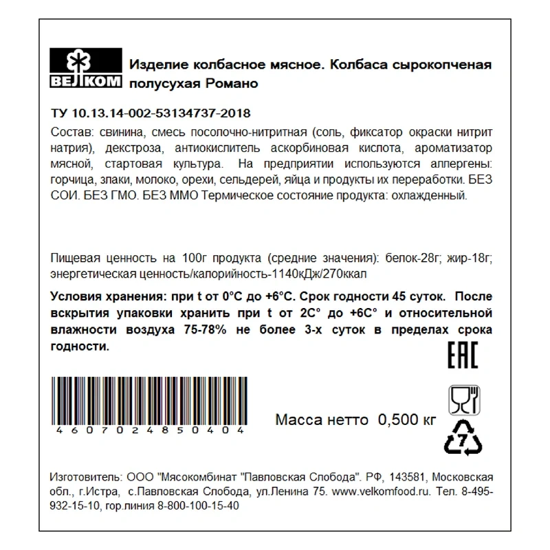 Колбаса Велком Романо сырокопченая полусухая нарезка, 500г