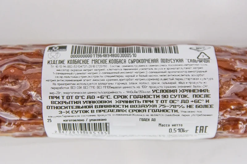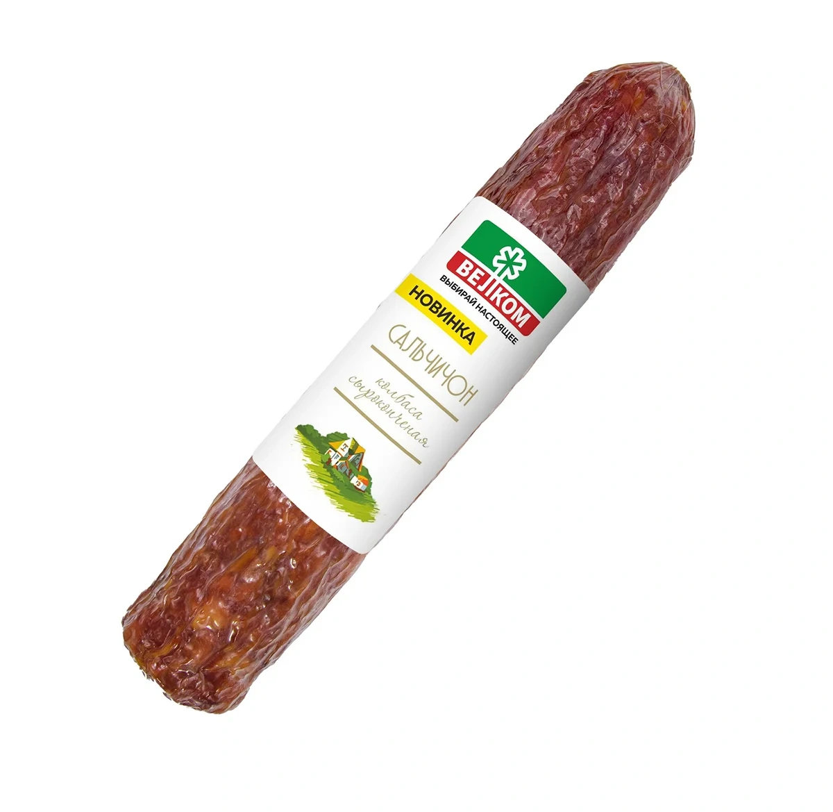 Колбаса сырокопченая Велком Сальчичон – выдержанный мясной деликатес с благородным насыщенным вкусом, гармонично дополненным пряными нотами. Это отличный выбор для праздничной нарезки, вкусных бутербродов в дорогу, мини-закусок к игристым и пенным напиткам.