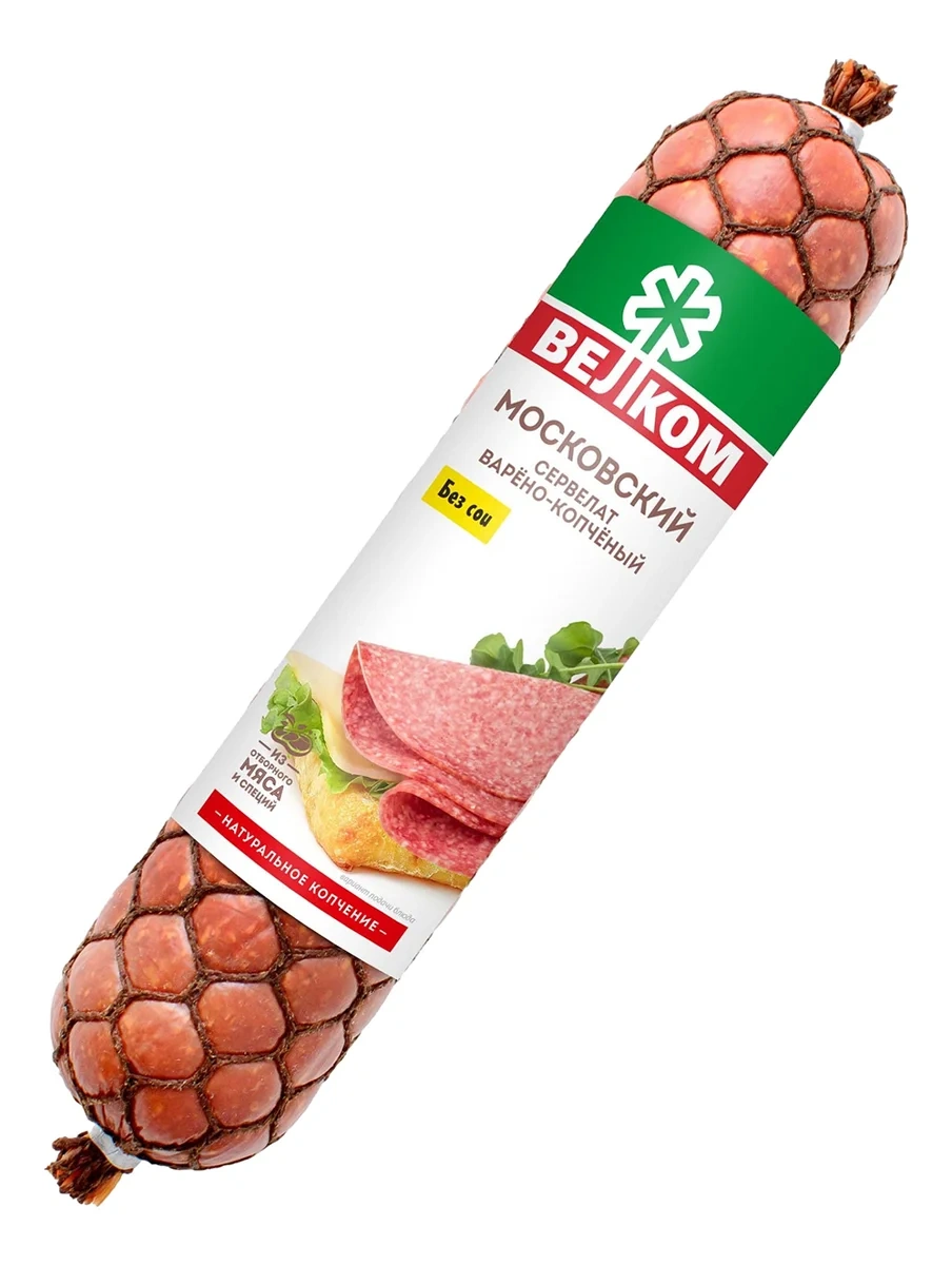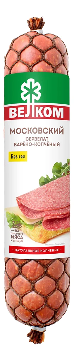 Колбаса Велком Сервелат Московский варено-копченая, 580г – ароматный мясной деликатес, приготовленный по особому рецепту с добавлением ароматных пряностей.