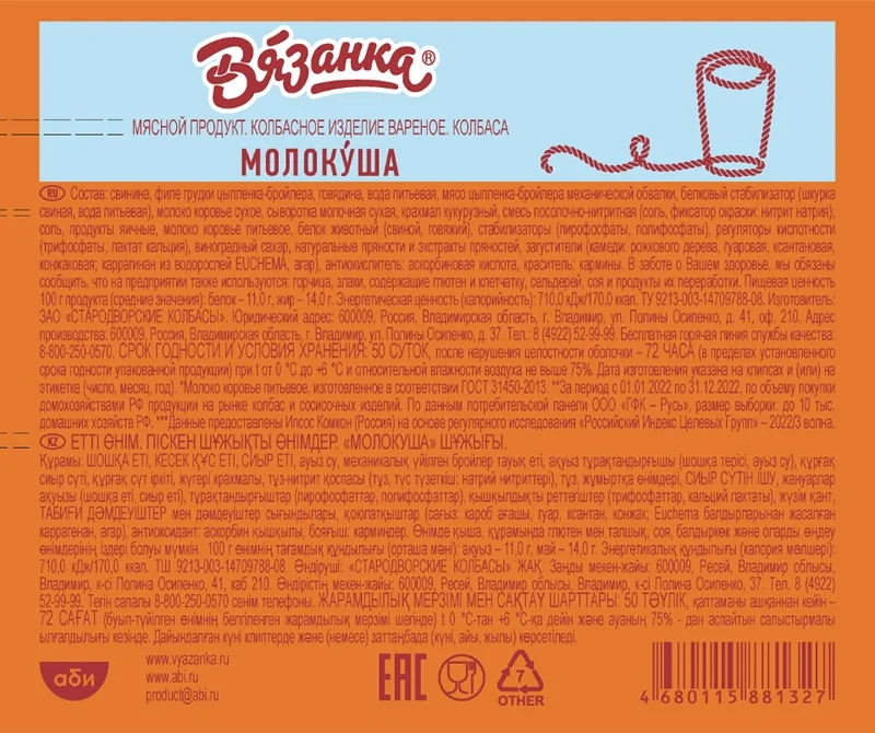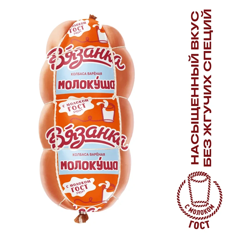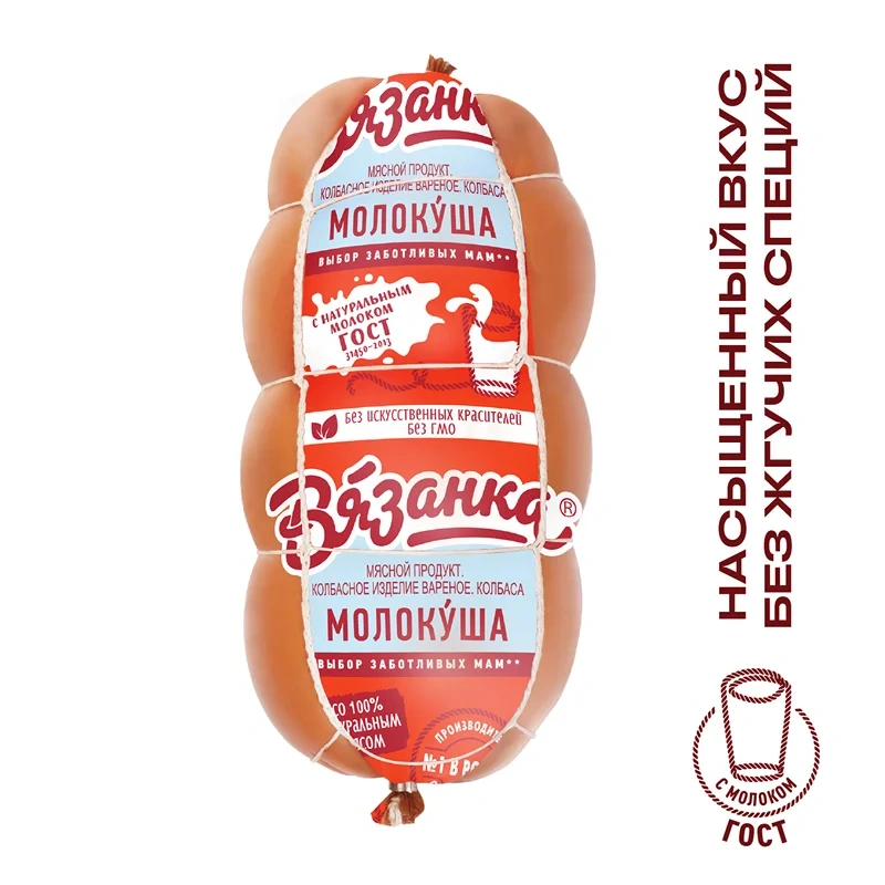 Колбаса вареная Молокуша от Вязанки обладает насыщенным вкусом и не содержит жгучих специй. Молоко, входящее в состав колбасы, и отсутствие жгучих специй дают возможность мамам с уверенностью давать колбасу своим детишкам.