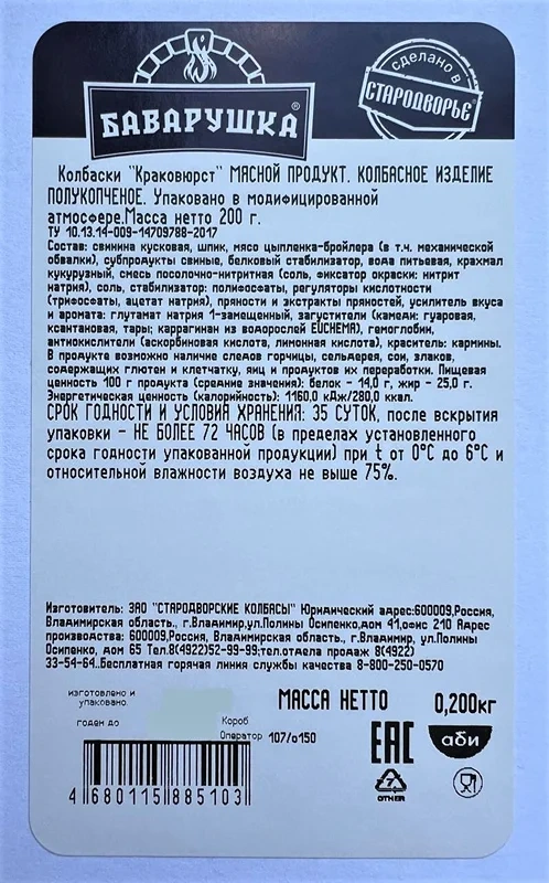 Колбаски Краковюрст Баварушка с изысканными пряностями, 200г