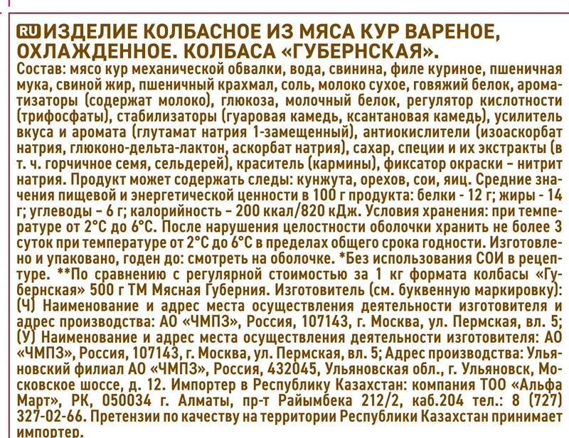 Колбаса губернская Мясная губерния вареная, ~1.5кг
