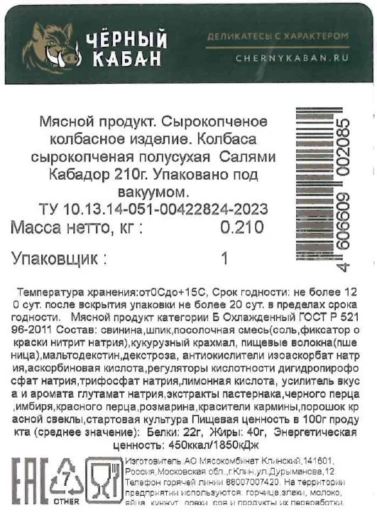 Салями Черный кабан Кабадор сырокопченая, 210г